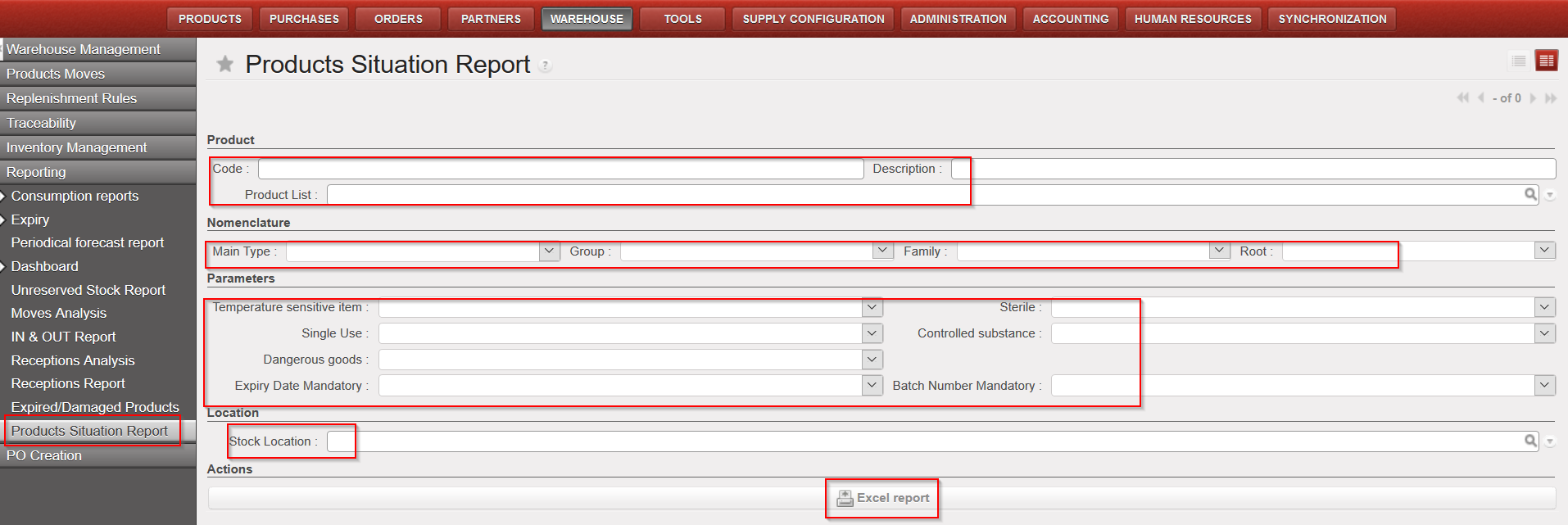 Go to: Warehouse / Reporting / Products Situation report