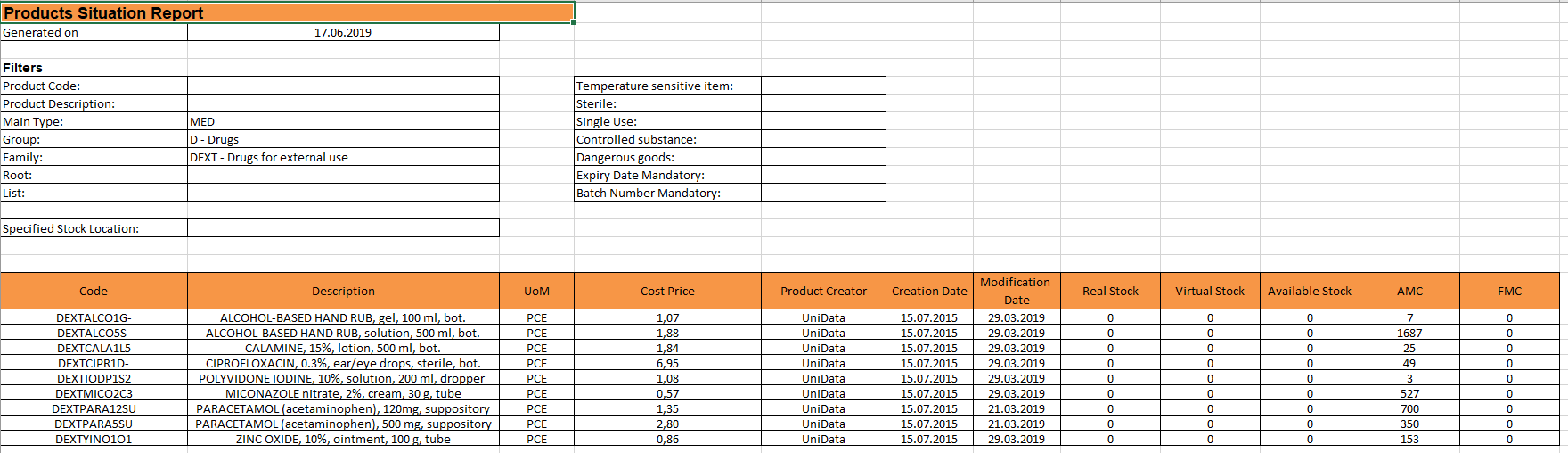 Supply User Manual ENG -> 5. Warehouse -> 5.16 LU-SU4302: Stock Inventory Reports -> I. PRODUCTS SITUATION REPORT