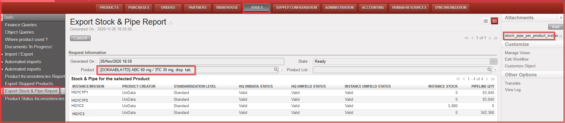 The results give visibility of: Product Code, Description, Product Creator, Standardization level, UD status, UF status, Instances (name), Instance stock (qty) and Pipeline quantity (reminder: pipeline is calculated starting from a Validated PO line).