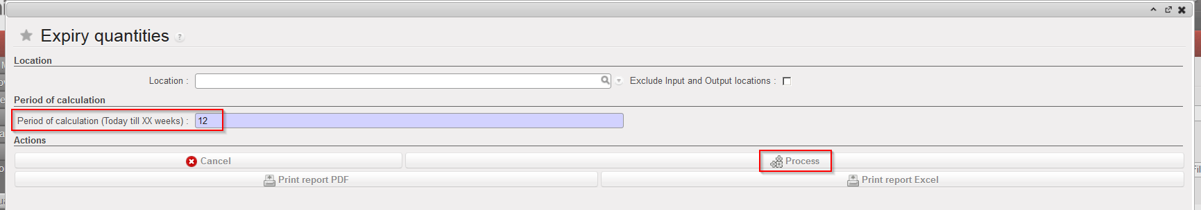 This report allows to see batches/quantities already expired and batches/quantities which will expire within XX weeks. It is actually a simple “picture” of batches in your instance.
