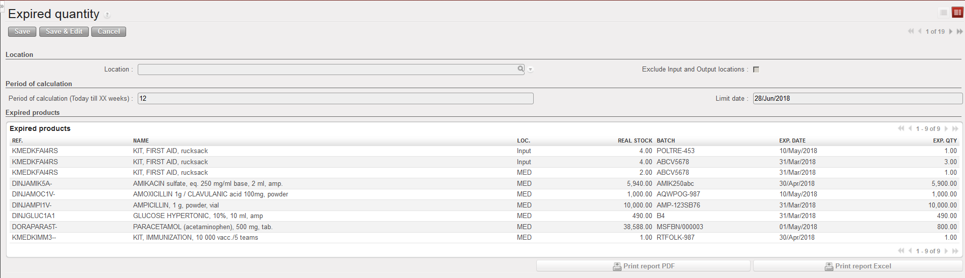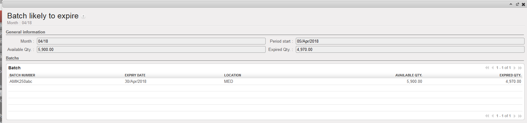An on-screen report is produced. Expired batches and batches which will expire within XX weeks are showed. The current real stock per product and location (not per batch) is also showed.