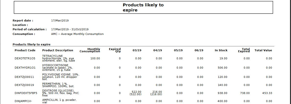 This tool shows the products with their respective quantities which are likely to expire, based on the defined Forecasted Monthly Consumption, Average Monthly Consumption, RR-Average Monthly Consumption or Real Average Consumption. This should be helpful in preventing products from expiring before being used or sent where they can be used by giving visibility.