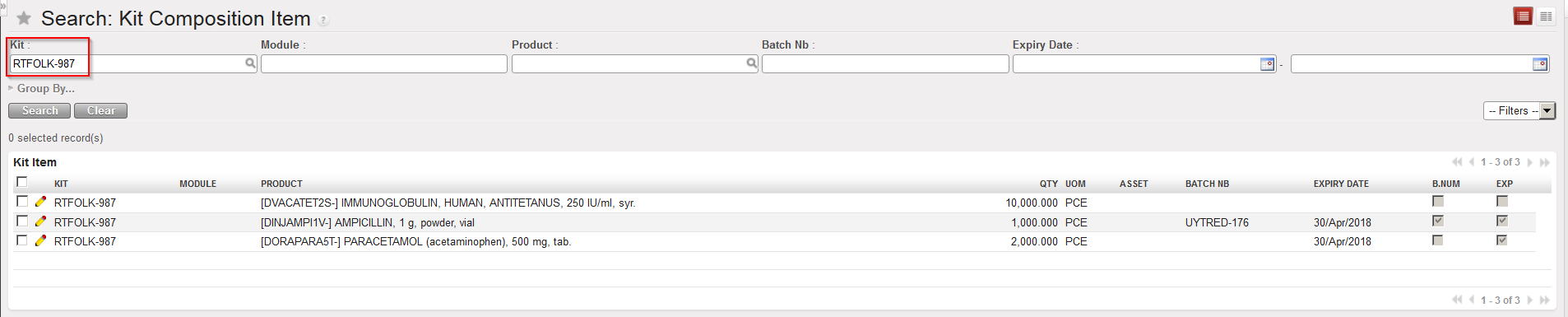 By default, the kit should be associated with the earliest expiry date, but it could still be useful to check the expiration of each of the kit’s components. Please note that it will only be possible to check this for kits which have a Kit Composition List.