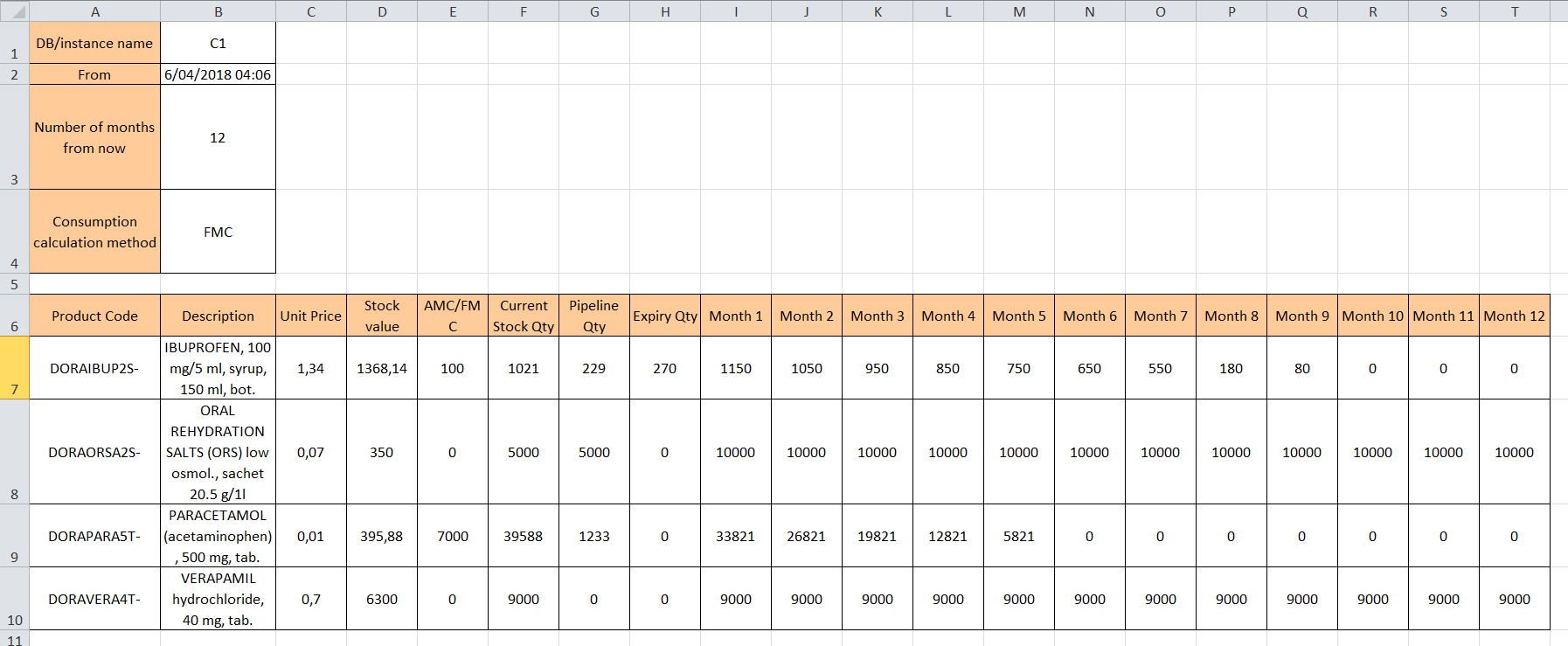 This report exports all products as requested according to filters. In the generated file, in the forecast for weeks/months shown, stock quantity should not fall below 0 (i.e. no negative quantities).