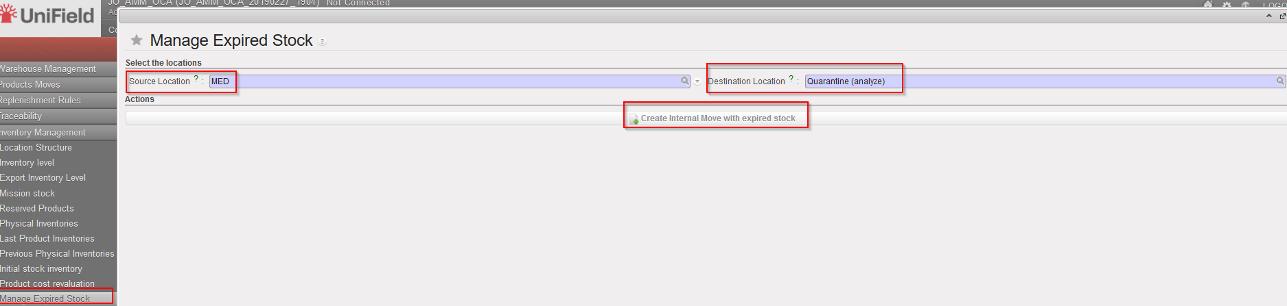 In order to ease management of Expired Stock , the “Manage Expired Stock” feature enables the user to automatically create an Internal move, INT, for products which have expired and need to be send to Quarantine or Destroyed or the second option for the products which are not yet expired but will be expiring soon: “Soon to be expired“. The selection of these expired products needs to be done per location.