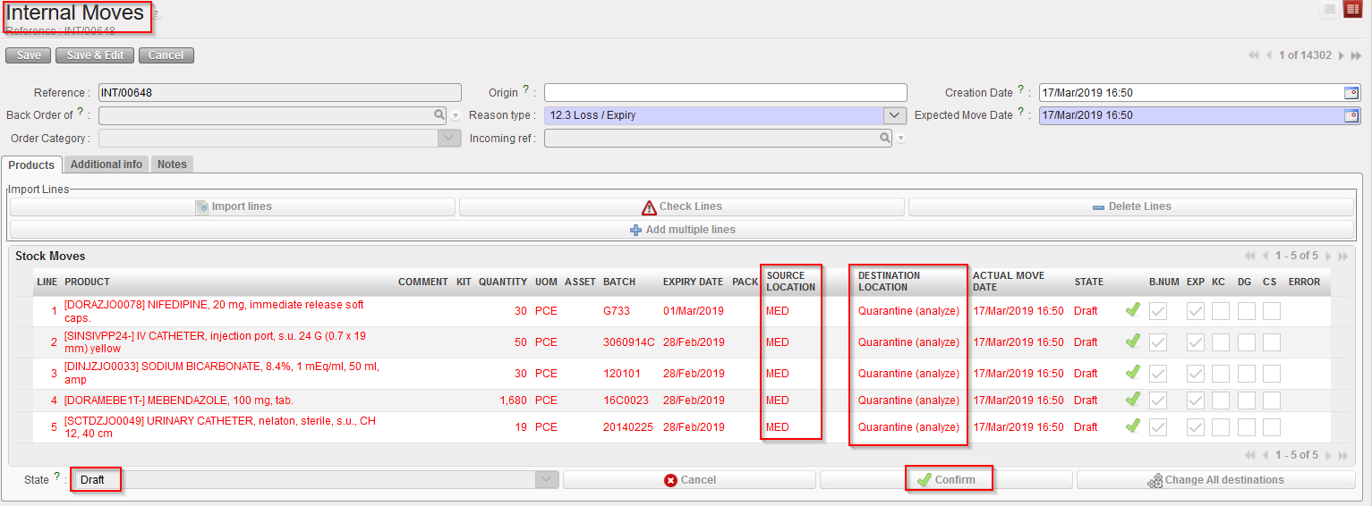 UniField offers the possibility to generate a report that will display all the INT that are sent to “Quarantine (analyze/ before scrap)” or “Destruction” locations. This will help user to better track the expired and damaged products.