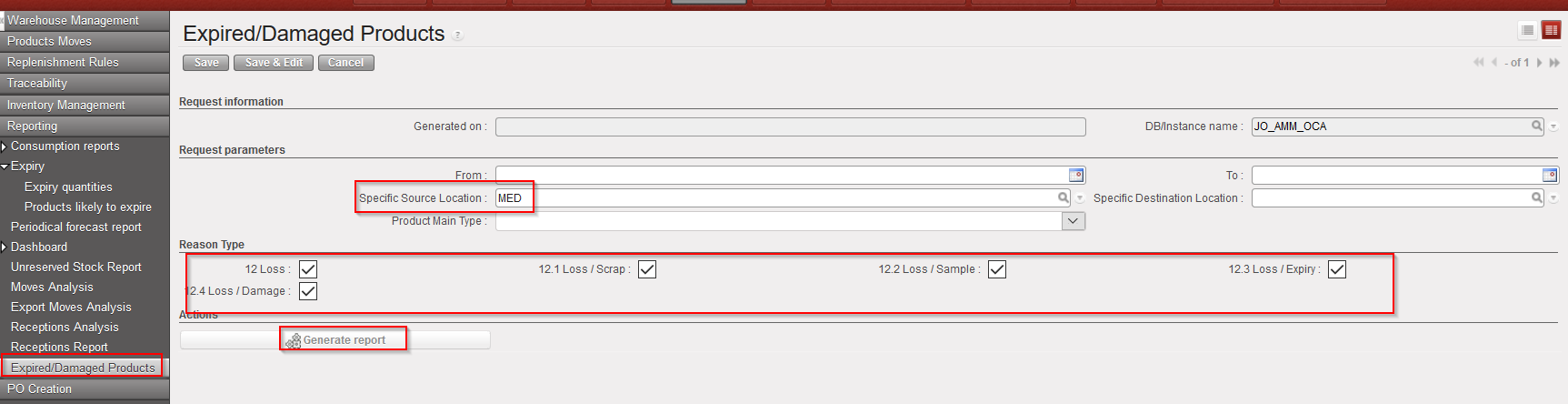 Go to: Warehouse / Reporting / Expired/Damaged Products