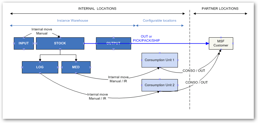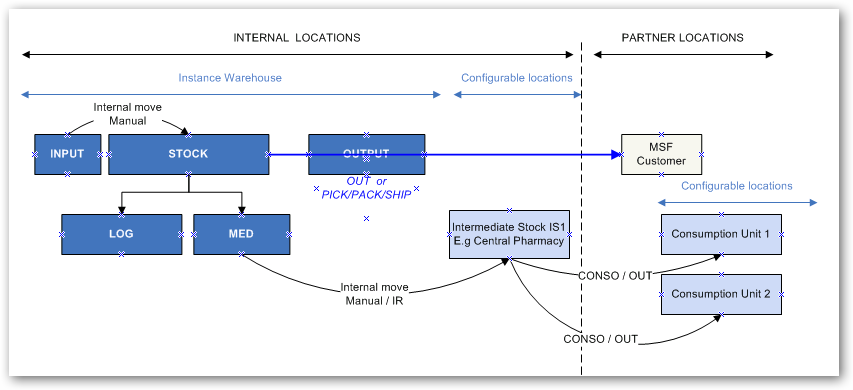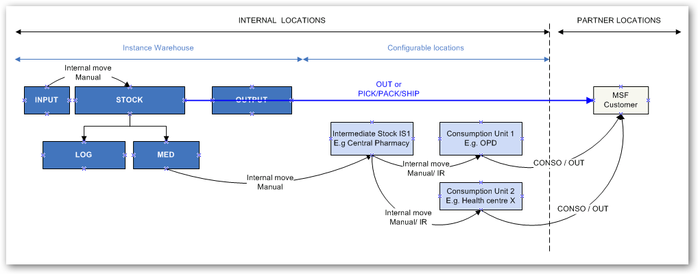 Internal: In the system there are 2 options for configurable internal locations – Intermediate stocks and Internal Consumption units. There is full visibility of stock (qty, batches, value etc) in any internal location, and this location can be selected also for sourcing purposes (see section on Order Sourcing Tool). In this context, internal consumption units are not considered as “last customers”, as the products are still within the instance. Technically there is no difference between Intermediate stocks and internal Consumption Units, but they are named differently to assist end users in understanding flows and last internal point in instance.