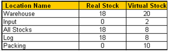 Table showing quantities for real stock and virtual stock for a product (scissors)