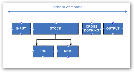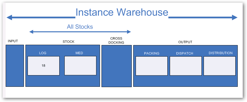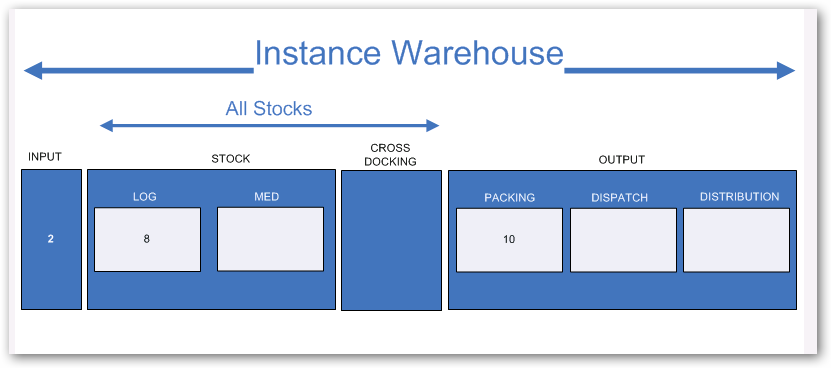 Each instance will have a warehouse created by default at the instance creation, and the default locations are: Input, Stock (with children locations Log & Med), Cross-Docking and Output. These in theory represent locations in a physical warehouse where stock may be present. The Output location is further divided for the purposes of outgoing stock movements;