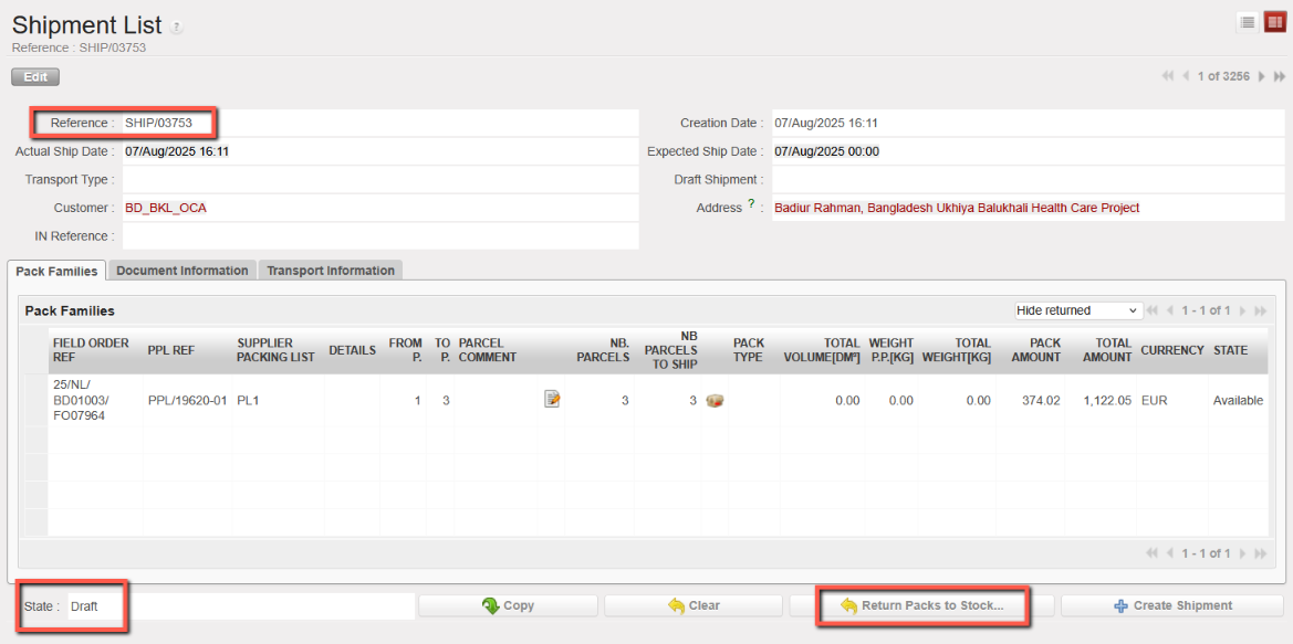 Products can also be put back in stock from a “Draft” (main) Shipment. This may be needed if parcels have been left behind and no shipment for customer X is planned in the near future. Instead of keeping the products in parcels on a “Draft” (main) Shipment (with approaching expiry dates) it might be wise to put them back in stock and to ship them to another project or use them locally, while other items will be picked when a shipment will be organized for customer X.