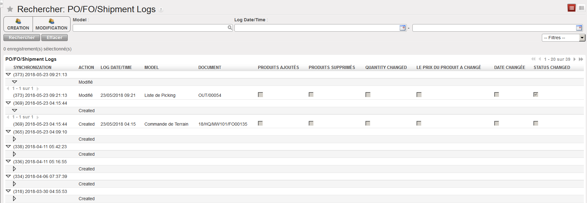 Allez à: Synchronisation / Surveillance / PO/FO/Shipment Logs