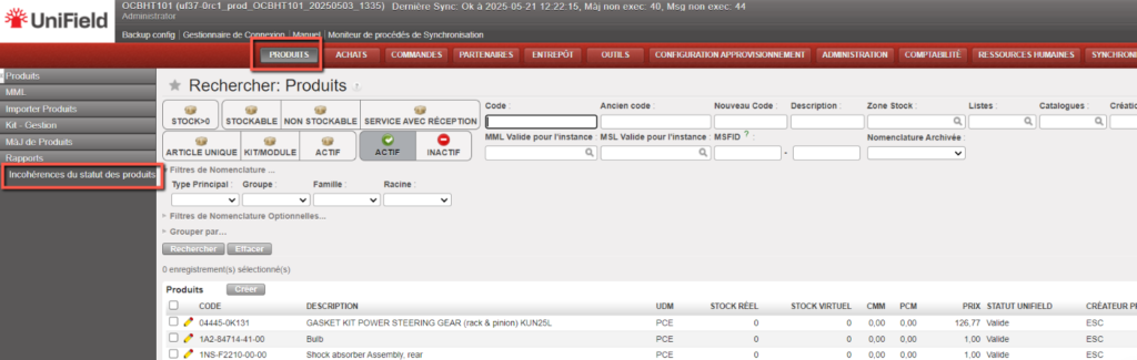 Aller à : Produits > Rapports > Incohérences du statut des produits