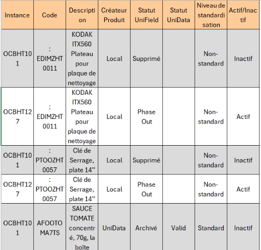 Ce rapport est généré dans Excel au niveau de la coordination et affiche tous les produits présentant une incohérence de statut entre la coordination et les projets. Les informations d’en-tête du produit sont affichées (code, description, créateur du produit, niveau de normalisation, statut UniData). Il convient de consulter les directives OC avant de prendre toute mesure supplémentaire.