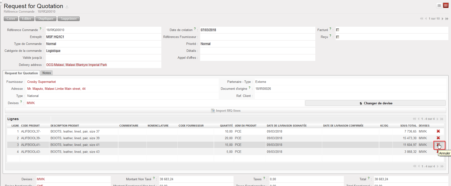 | Annuler une ligne de RFQ |