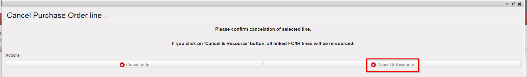 - Dans la fenêtre qui s’ouvre, sélectionnez “Cancel & Resource”. Notez que vous pouvez aussi choisir de simplement annuler la ligne de RFQ, mais le re-sourcing de cette ligne ne sera alors pas possible.