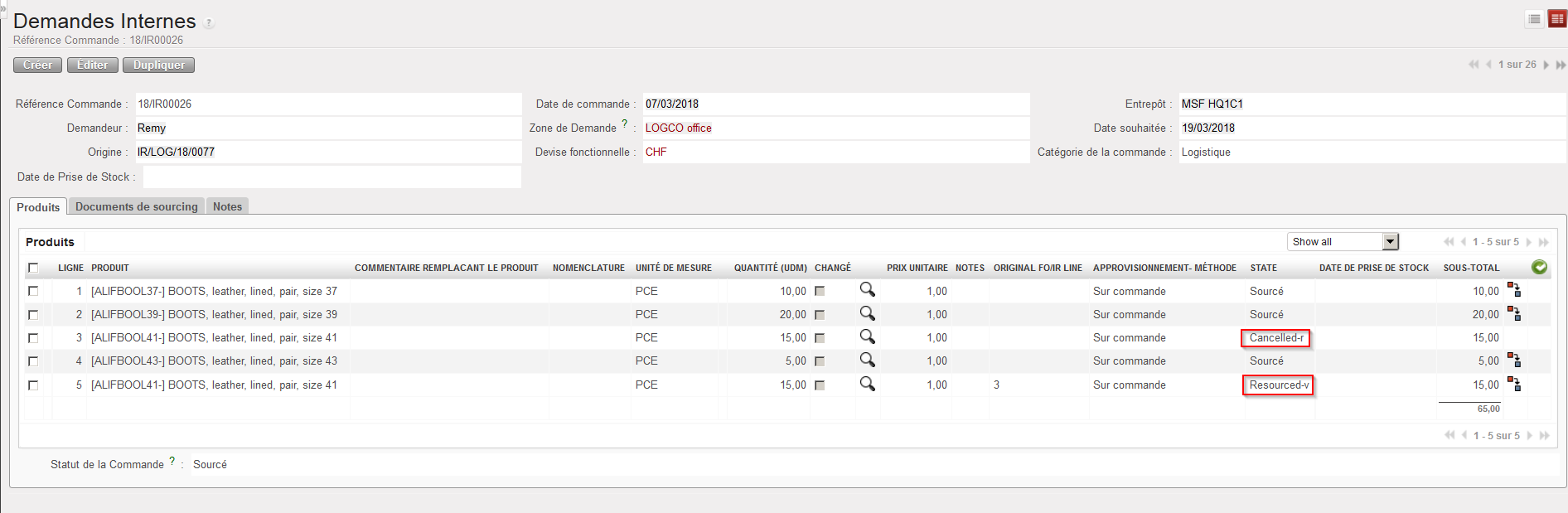 4. Sur l’IR qui avait été sourcée sur commande pour créer la RFQ, la ligne qui a été annulée & re-sourcée sur la RFQ est maintenant dans le statut “Cancelled-r” tandis qu’une nouvelle ligne (copie de la ligne annulée) est ajoutée à l’IR dans le statut “Resourced-v”, prête à être ressourcer à travers l’OST.