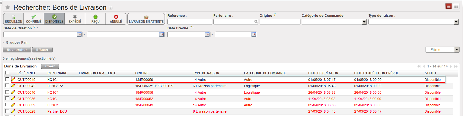Par défaut, le filtre “Disponible” est activé, et seuls les Bons de Livraison au statut “Disponible” sont affichés. Notez que dans l’exemple ci-dessous, une IR avec Zone de Demande = ECU est sourcée sur commande (PO). Ce PO est confirmé et le IN lié est partiellement réceptionné.