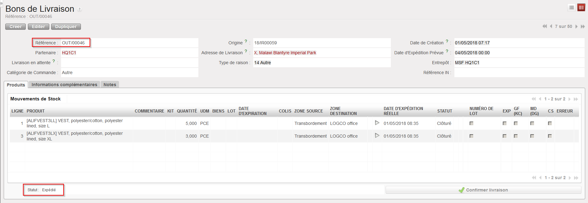 Si le OUT est seulement partiellement traité (comme c’est le cas dans l’exemple ci-dessus), un back-order est créé. Les produits/quantités traités sont enregistrés sur un nouveau OUT dont le statut est “Expédié“, tandis que le OUT initial reste ouvert (au statut “Confirmé“) afin de pouvoir traiter les produits et quantités qui seront reçus en cross-docking dans le futur.