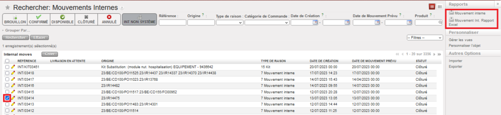 - En utilisant une case à cocher, sélectionnez le Mouvement Interne que vous souhaitez exporter.