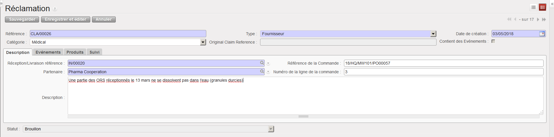 2. Vérifiez les champs “Référence”, Type” et “Date de création”. Modifiez leur contenu si besoin. Le “Type” doit être “Fournisseur” si la réclamation est adressée à un fournisseur pour des marchandises non conformes. “Transport” est utilisé pour la non-conformité de services de transport. “Client” est utilisé pour enregistrer une réclamation qui vous est adressée par l’un de vos clients.