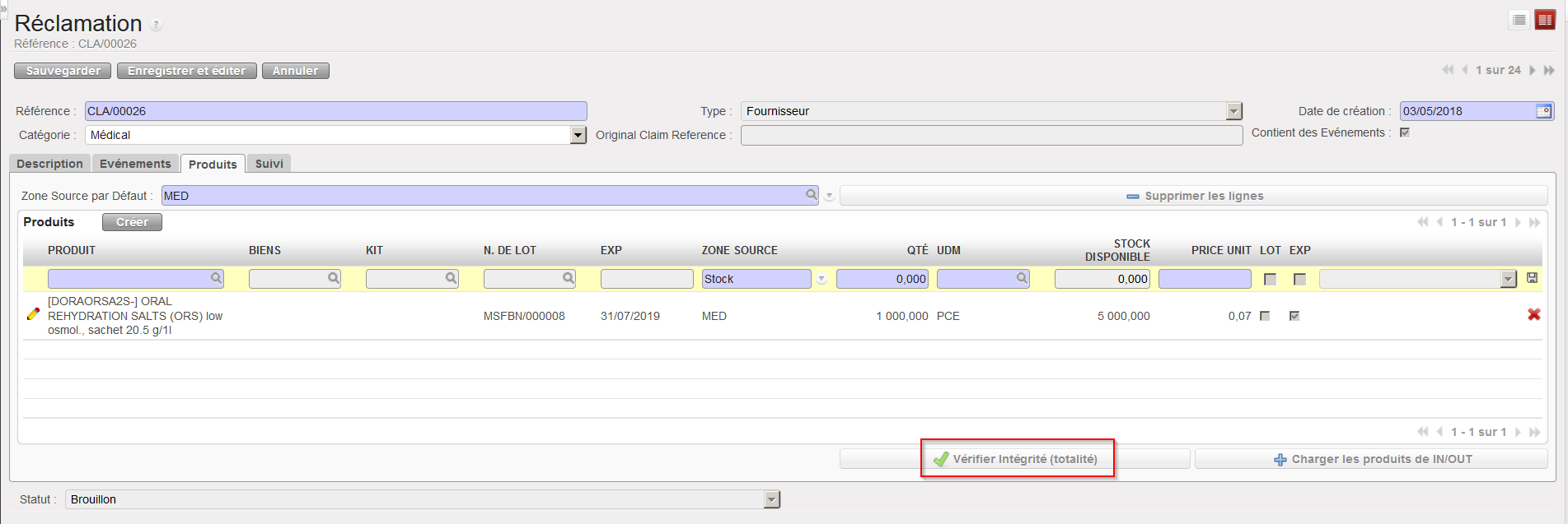17. Cliquez sur le bouton “Vérifier Intégrité (totalité) afin de vérifier que les produits sont bien disponibles dans la zone source.
