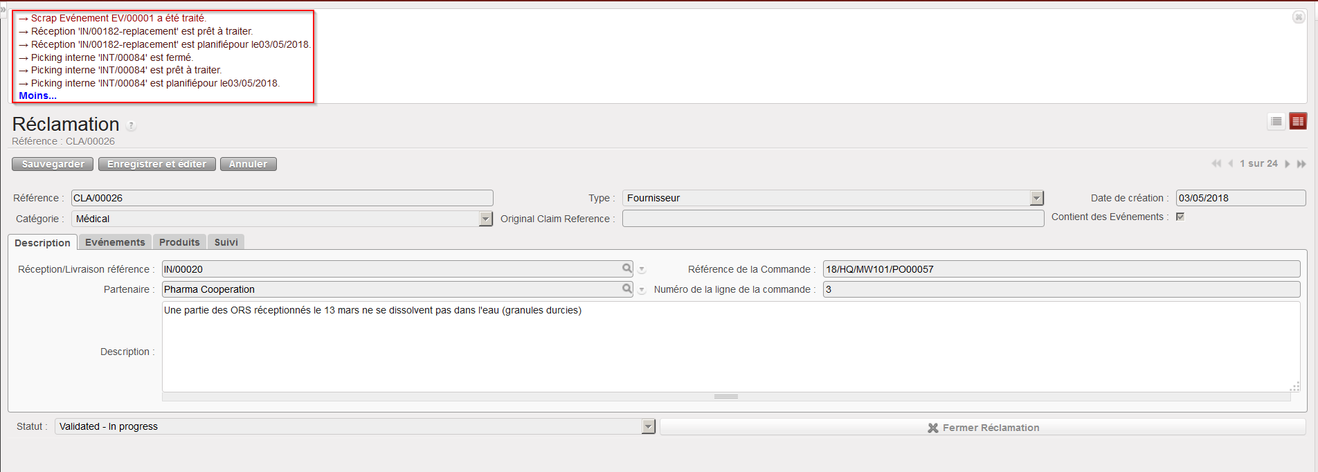 18. Cliquez sur la flèche verte afin de traiter l’évènement de la réclamation. Un message apparait pour confirmer (en fonction de l’évènement) qu’un picking interne (INT) a été créé, traité et clôturé (si vous avez sélectionné “Rebuts” comme type d’évènement), que la réception IN-replacement est prête à être traitée (si la case “Replacement expected” a été cochée) et que l’évènement a été traité.