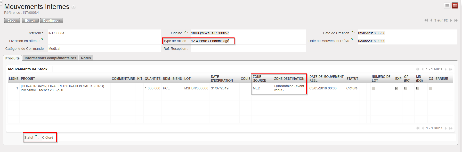 - Crée et traite un Mouvement Interne (INT) pour déplacer les marchandises depuis la zone source vers la zone “Expiré / Endommagé / Pour Rebus“