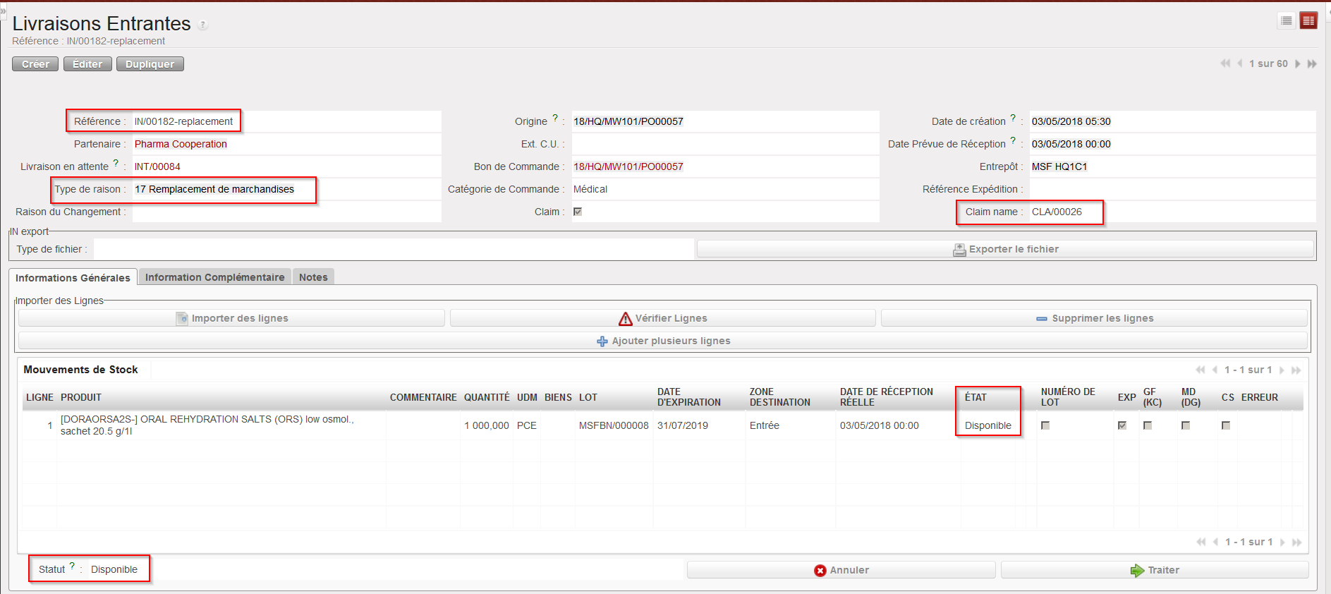 - Crée une Livraison Entrante (IN-replacement) pour le remplacement des marchandises