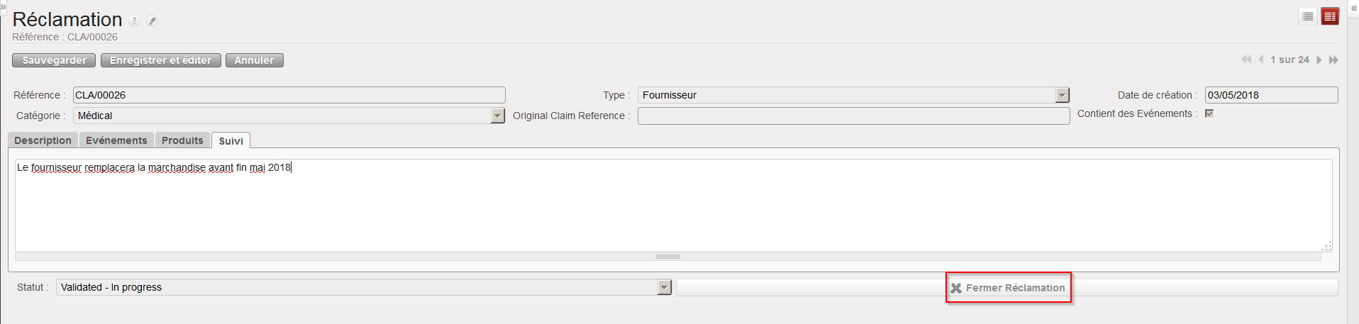 - Lorsque la réclamation peut être clôturée (e.g. les marchandises ont été remplacés et tout est clarifié au niveau facturation), vous pouvez fermer la réclamation en cliquant sur le bouton “Fermer Réclamation“.