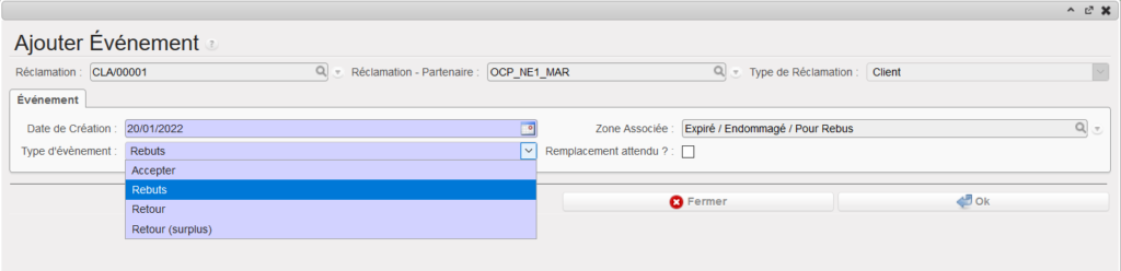 Avec les options sélectionnées plus haut (type d’évènement = Rebuts et remplacement des marchandises demandées), le système: