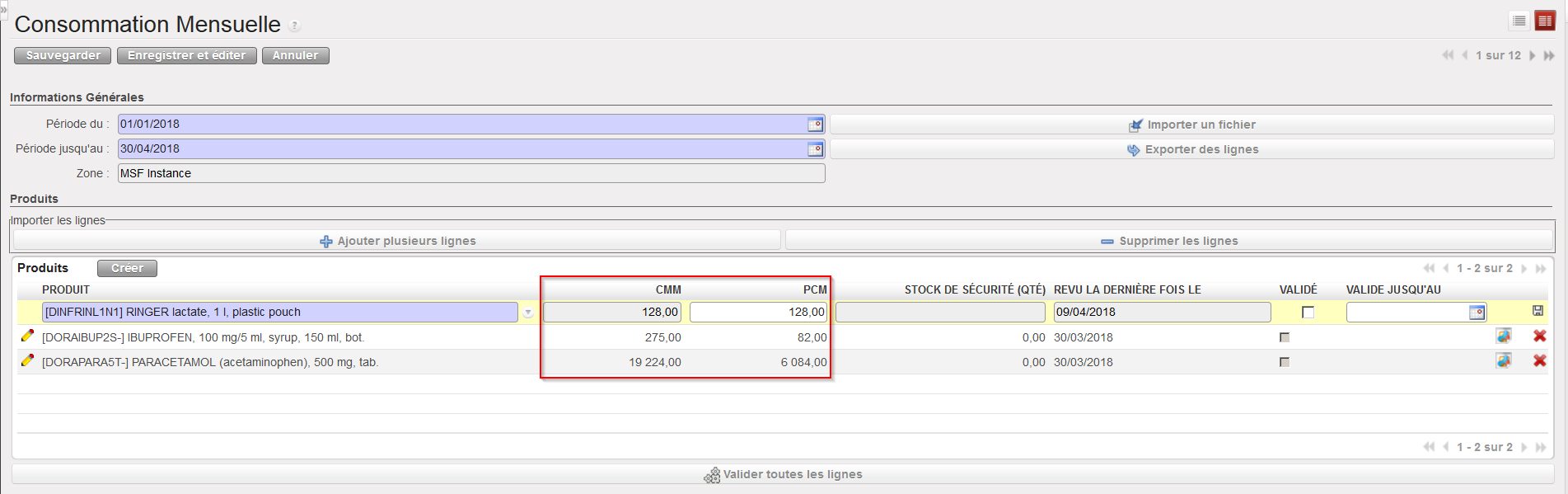 6. La CMM des produits sélectionnés sur la période spécifiée est affichée. Elle n’est pas éditable car elle est calculée par le système, sur base des données de consommation disponibles dans UniField.