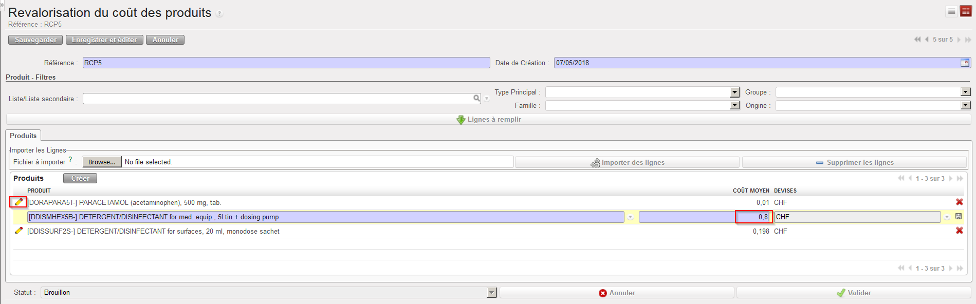Il peut arriver que le coût des produits d’une instance (prix moyen de la fiche PMD) ne soit pas/plus correct. Cela peut être expliqué par différentes raisons comme une mauvaise utilisation du système, l’inflation, une variabilité des prix,… Les conséquences directes d’un coût de produit incorrect sont que son stock ne sera pas correctement valorisé dans les rapports et que les commandes ne proposeront pas de prix valables.
