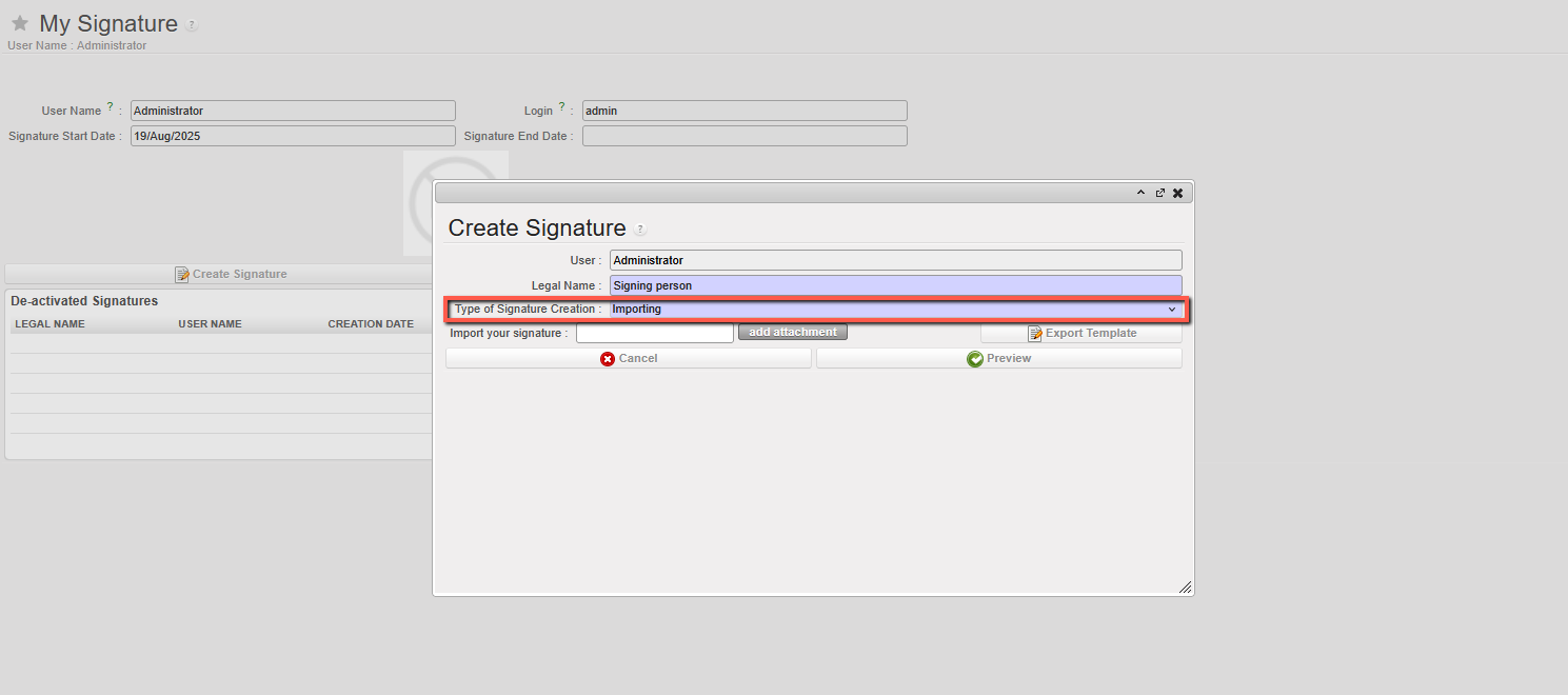- When adding their signature, user can choose “Type of signature creation” options “importing” (scanned signature) or “drawing” (directly in UniField with mouse etc).