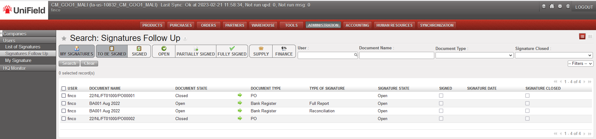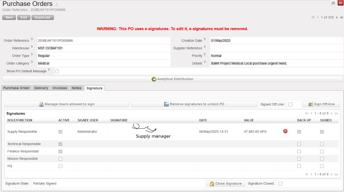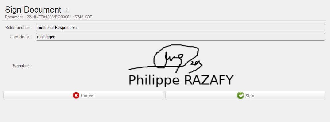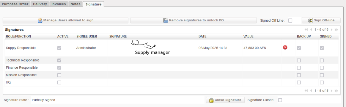 A document has always multiple signature fields. E.g. on PO, there are “Supply responsible”, “Technical Responsible”, “Finance Responsible”, “Mission Responsible” and “HQ”. On cash reconciliation, there are two signature fields.