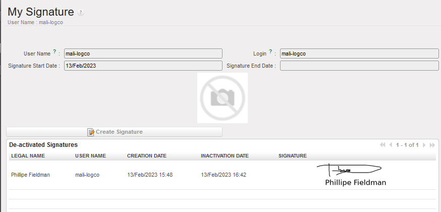 Go to Administration/Users/My signature, user name, status validity date, sample signature and legal name are displayed.