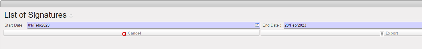 Go to Administration/Users/List of signatures. This menu is displaying the signature samples and their respective validity dates. From right hand [action] menu, click on [List of signatures] in order to extract the list of signatures for a given period. Fill the start and end date. Then click on [Export].