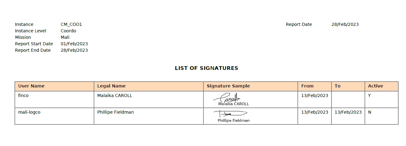 The list shows UniField user names, legal names, signature samples, and respected validity dates and status. This report could be used to replace the hand filled signature sample currently collected manually.