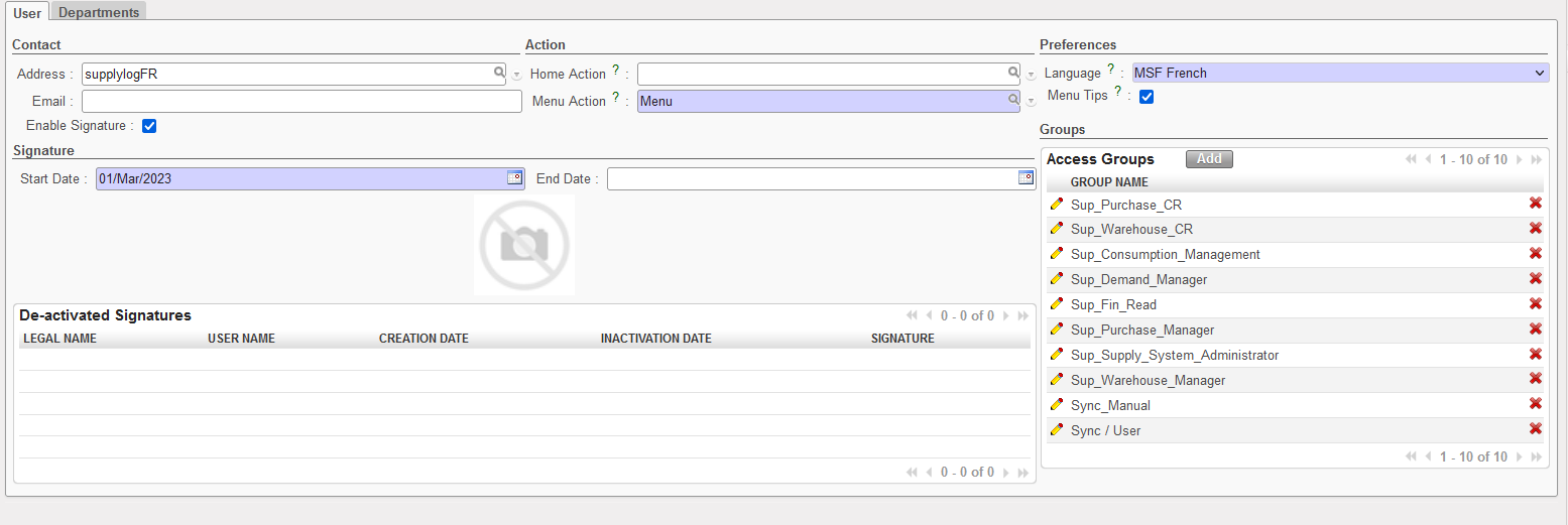 The country programs define which signature access only need to be created for non UniField users (Medical, HR, …). Note that there is only one access group allowing users to sign: “Sign_user “. It is valid to sign on supply or finance objects/report.