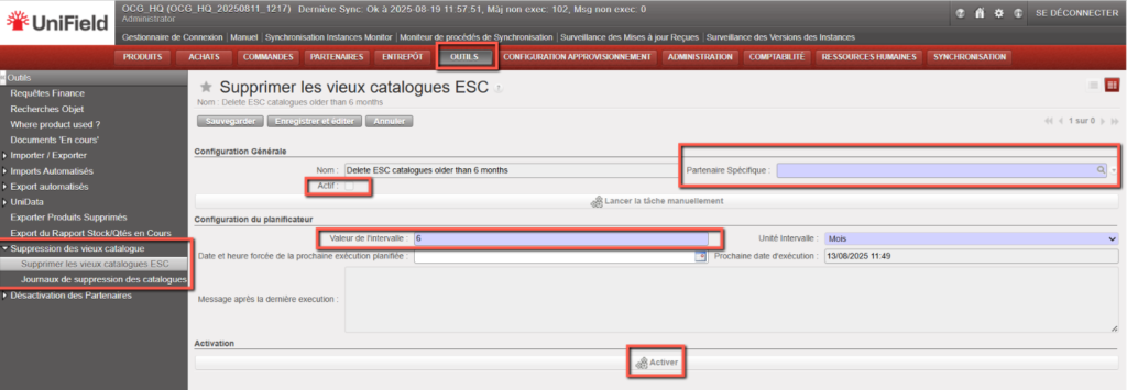 Manuel de l’Utilisateur Supply -> 3. Produits -> 3.4 Produits d'un Catalogue Fournisseur -> E. Comment configurer la suppression automatique du catalogue des fournisseurs ESC