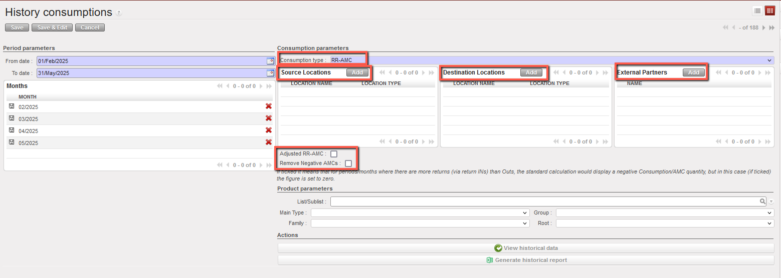 Historical Consumption Reports are designed to analyze Average Monthly Consumptions (AMC), Real Average Consumption (RAC) and RR-AMC, as described below. It displays the consumption rates but also the actual consumptions month by month, allowing you to analyze variations.