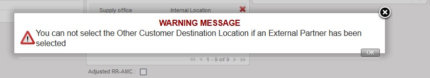 – If “Other Customer” is selected as the destination and you attempt to select one or more External Customers, a warning message will block this action.