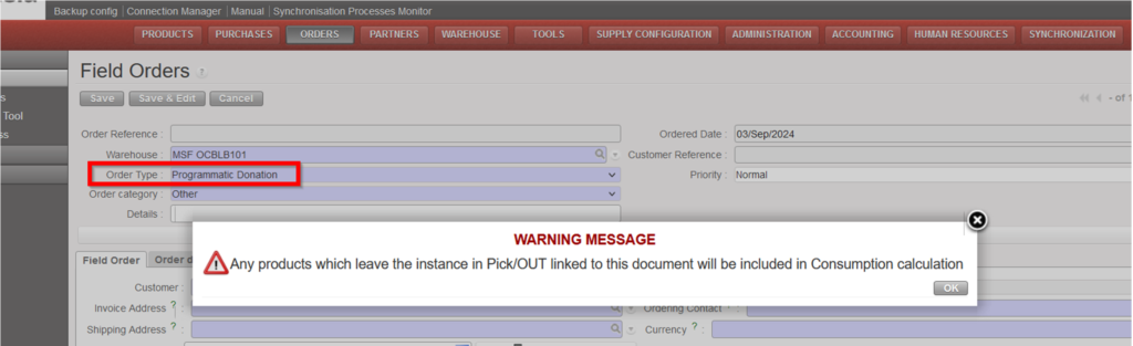 The process of creation of a “Programmatic Donation” is the same as for the “Donation to prevent losses”., the difference is that when you select Programmatic Donation from order type it will pop up with warning message “Any products which leave the instance in Pick/OUT linked to this document will be included in Consumption calculation “then click on “Ok”