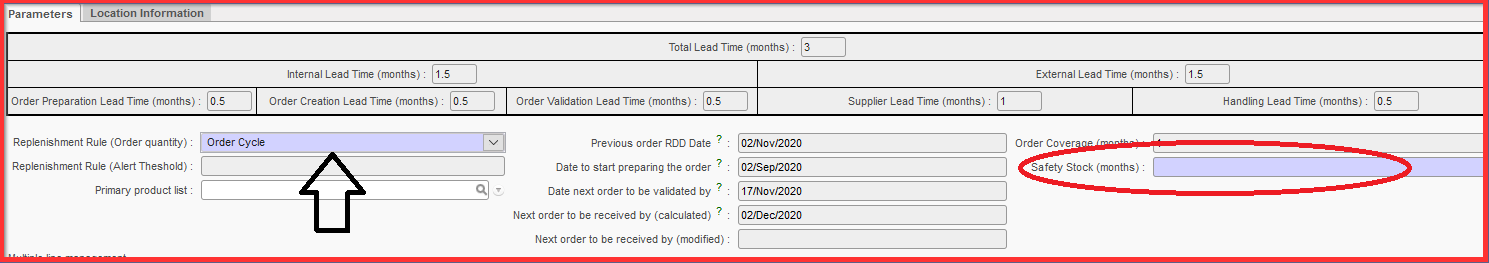 - If user chose “Order Cycle” then a “Safety Stock” option appears on UF screen where we must select our value based on Unit of Time configuration. “Safety stock” in months of consumption. For the safety stock as for the other product statuses, the Lead time is not considered in this averaged calculation, only the Order Coverage time.