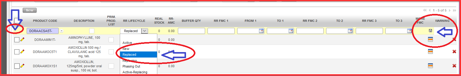 c) “Replaced”/ “Replacing”: we can also replace one product by another one (decision made based on project strategic decisions, decisions is outside UF system). Within the segment if we have a “Replaced” product, we must have set out a “Replacing” product which is linked to the replaced product. The system cannot guess which the pair of the “Replacing”/”Replaced” product is so the opposite must be added for each. Edit the line with the product which needs to be replaced.