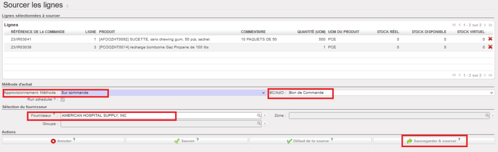 - Le bouton “Sauvegarder & sourcer” pour sauvegarder les valeurs entrées sur toutes les lignes sélectionnées et sourcer directement ces lignes. Toutes les lignes seront sourcées de la même manière (du stock ou sur commande).