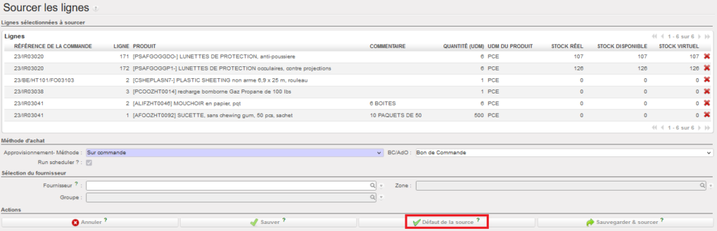 - Si, via l’écran principal de l’OSC, vous avez déjà mis à jour une par une toutes les lignes de commande en indiquant la méthode d’acquisition, le BC/ADO, la zone ou le fournisseur sans pour autant cliquer sur la flèche verte au bout de chaque ligne et que vous ne souhaitez plus rien modifier, vous pouvez les sourcer directement en cliquant sur le bouton “Défaut de la source” au bas de l’écran qui apparaît. Le bouton “Défaut de la source” vous permet de sourcer plusieurs lignes, même si différentes méthodes de sourcing ou différents fournisseurs ont été sélectionnés.