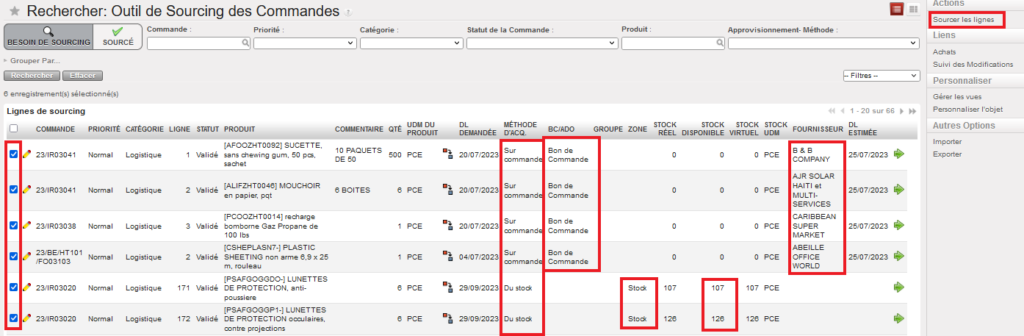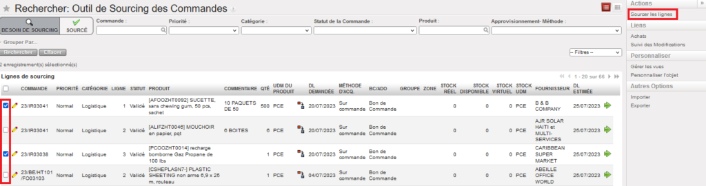 - Cochez les cases de toutes les lignes que vous souhaitez sourcer en même temps (à gauche des lignes de commande).