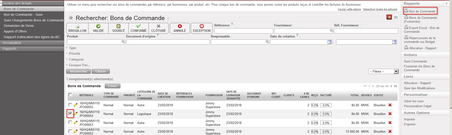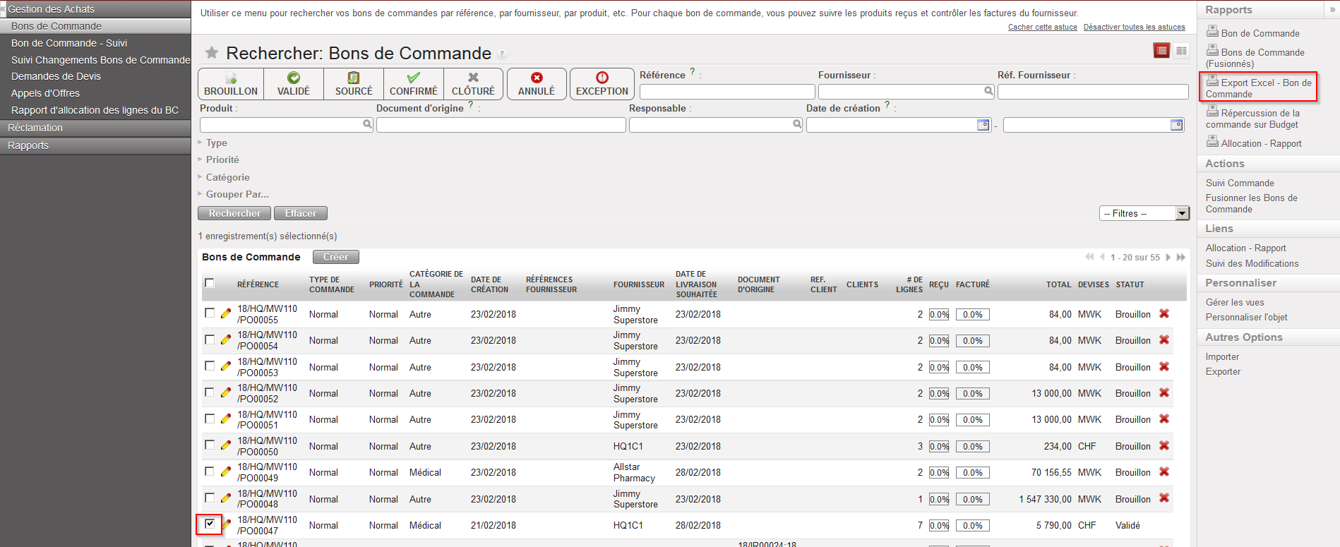 Note 2: L’export vers Excel et PDF peut également être fait depuis le PO même car les options “Export Excel – Bon de Commande” et “Bon de Commande” y sont également disponibles dans le panneau de droite (sous “Rapports”).