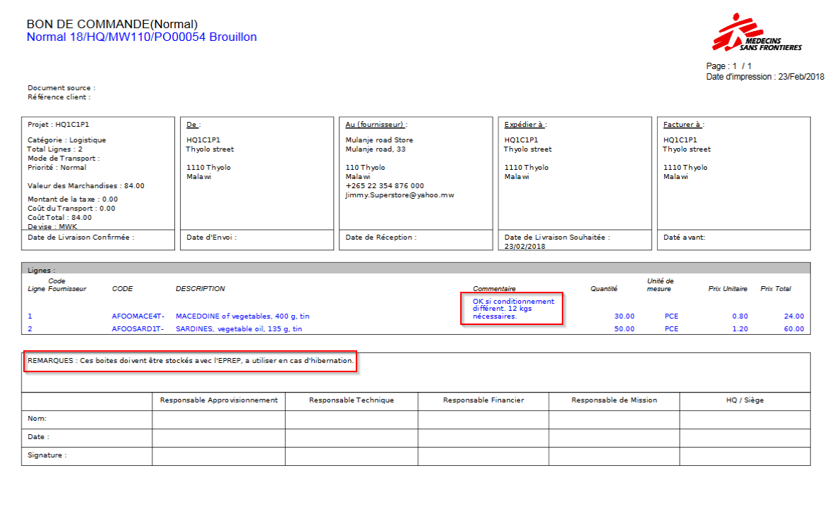 Note 4: Si vous exportez en PDF, au niveau entête, les notes introduites sur l’onglet “Notes” du PO, apparaitront (au bas du PDF, derrière “REMARQUES”). Au niveau ligne, les commentaires introduits sur l’onglet “Sélection de la Nomenclature” des lignes du PO apparaitront (dans la colonne “Commentaire” du PDF) mais les notes introduites sur l’onglet “Notes” du PO n’apparaitront pas.